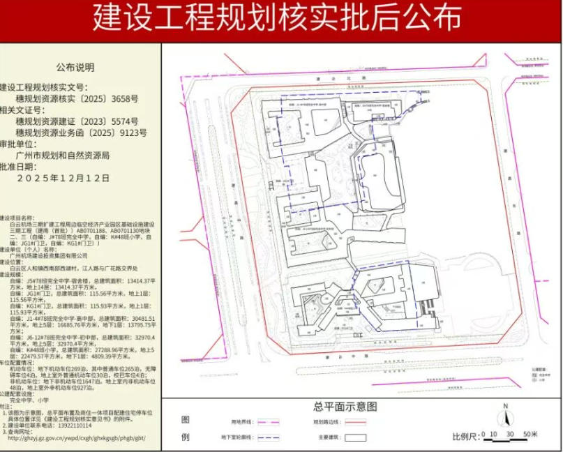学校位于广州市白云区人和镇西南部西湖村,江人路与广花路交界处,小学规划48个班,完全中学规划78个班(初中42班和高中36班)。